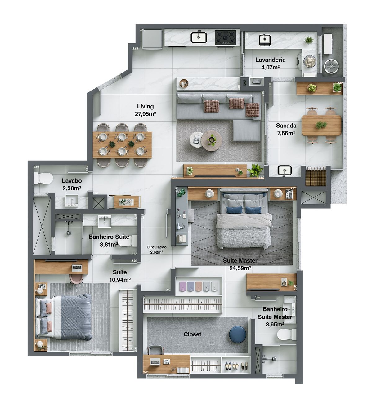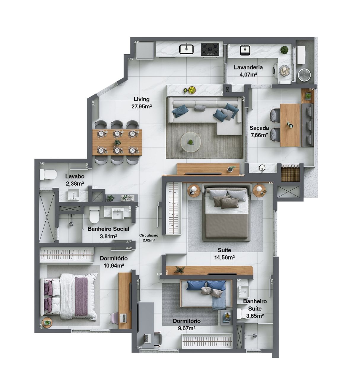 Apartamentos com 101 a 102 m² de área privativa, distribuídos de forma inteligente, moderna e elegante.